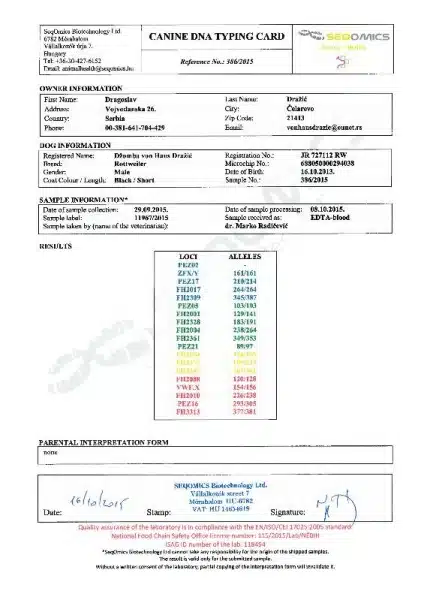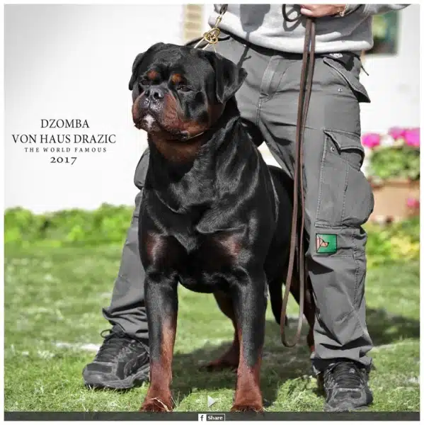 Rottweiler puppies » Rottweiler » Dzomba von Haus Drazic Dzomba von Haus Drazic More Information coming Soon…… Gallery Information Owner: Drazic Dragoslav Sire: Arlos Majestic Rott Dame: Felicita Terezsky Dvur D.O.B. October 16th, 2013 KSS: JR 727112 Rw Hip Rating: HD A Elbow Rating: ED 0 Coat Length: Clear (S/S) Hyperuricosuria: Clear (N/N) D. Myelopathy: Clear (N/N) JLPP: Clear (N/N) Height: 68.5 cm Weight: 63 kg