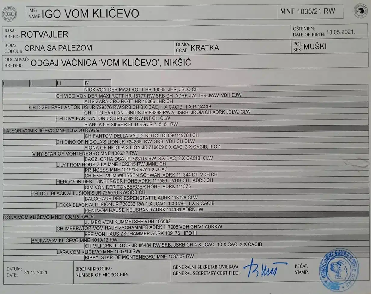 Igo Vom Klicevo is a well breed ADRK lined Rottweiler. As you can see from his pedigree ADRK and World Champions are within the first two generations. With his impressive pedigree, well documented health screening throughout his pedigree and his outstanding temperament you just cannot go wrong with one of his offspring