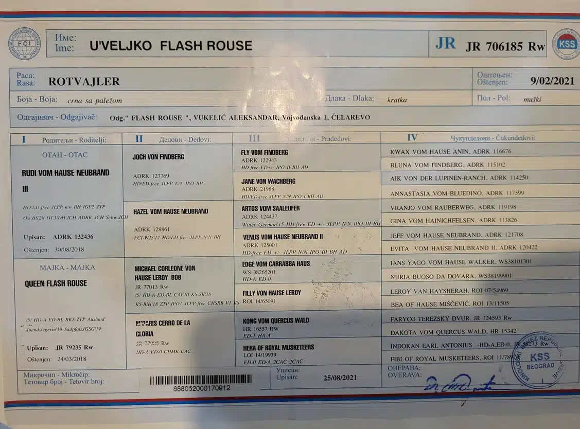 Rottweiler puppies » Rottweiler » U’Veljko Flash Rouse U’Veljko Flash Rouse ADRK Champion Coming Soon….. Gallery Information Owner: Aleksandar Vukelic Sire: Rudi Vom Hause Neubrand Dame: Queen Flash Rouse D.O.B. Feb. 9th, 2021 KSS: JR 706185 Rw Hip Rating: HD-A Elbow Rating: ED-0 JLPP: Clear (NN) Height: 68.5 cm Weight: 63 kg